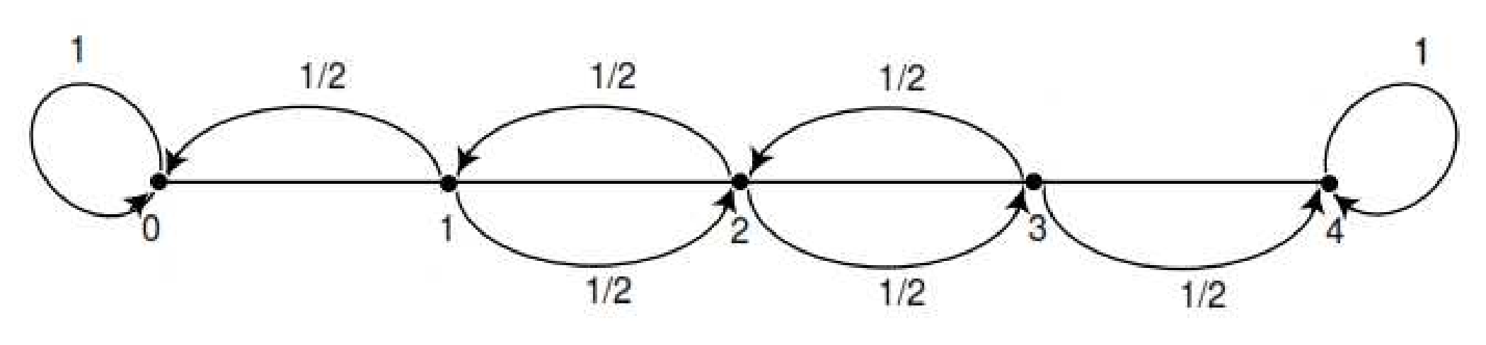Um homem caminha ao longo de um trecho de quatro quarteirões segundo o grafo na Figura 5. Se ele está no nodo 1, 2 ou 3, então ele caminha para a esquerda ou para a direita com a mesma probabilidade. Ele continua até que ele chegar ao nodo 4, que é um bar, ou ao nodo 0, que é a sua casa. Se ele atinge ou sua casa ou o bar, ele permanece lá. Podemos então construir uma Cadeia de Markov com estados em \(S=\{0,1,2,3,4\}\). Observamos que os estados 0 e 4 são absorventes. A matriz de transição é então \begin{equation*} \begin{matrix} & \\ \mathcal{P} = \begin{matrix} 0 \\ 1 \\ 2 \\ 3 \\ 4 \end{matrix} \left( \vphantom{ \begin{matrix} 12 \\ 12 \\ 12 \\ 12 \\ 12 \end{matrix} } \right. \end{matrix} \hspace{-1.2em} \begin{matrix} 0 & 1 & 2 & 3 & 4 \\ 1 & 0 & 0 & 0 & 0 \\ 1/2 & 0 & 1/2 & 0 & 0 \\ 0 & 1/2 & 0 & 1/2 & 0 \\ 0 & 0 & 1/2 & 0 & 1/2 \\ 0 & 0 & 0 & 0 & 1 \end{matrix} \hspace{-0.2em} \begin{matrix} & \\ \left. \vphantom{ \begin{matrix} 12 \\ 12 \\ 12 \\ 12 \\ 12 \end{matrix} } \right)\cdot \end{matrix} \end{equation*}