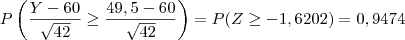 Denominando Y uma variável com distribuição normal, conforme os parâmetros acima, calculamos a probabilidade requisitada com o uso da distribuição aproximada: