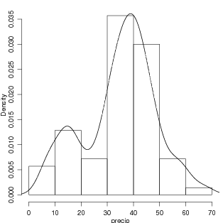 Basicamente, density() produz o resultado visto anteriormente criando uma sequência de valores no eixo-X e estimando a densidade em cada ponto usando os dados ao redor deste ponto. Podem ser dados pesos aos dados vizinhos de acordo com sua proximidade ao ponto a ser estimado. Vamos examinar os argumentos da função.